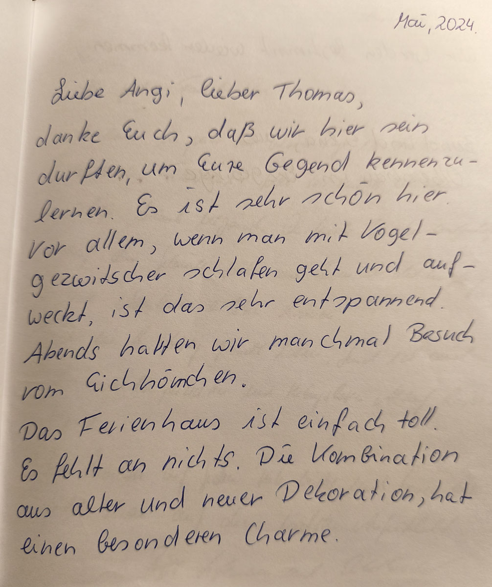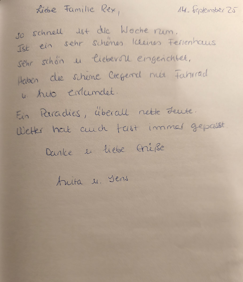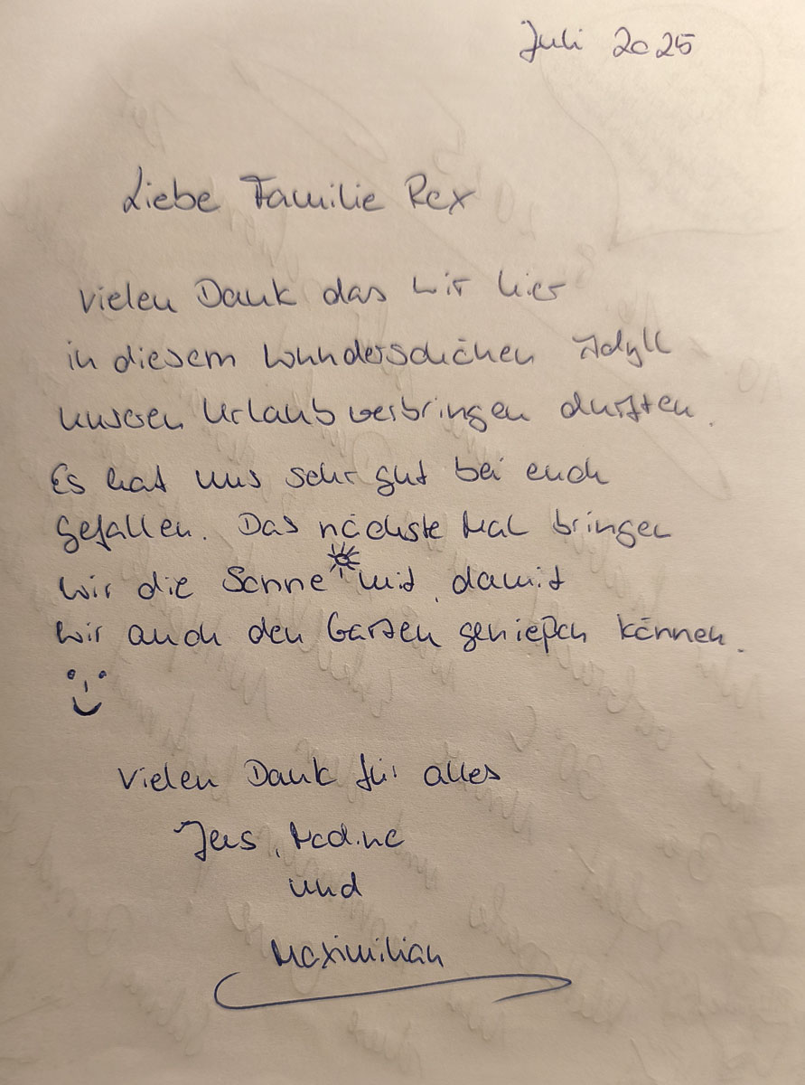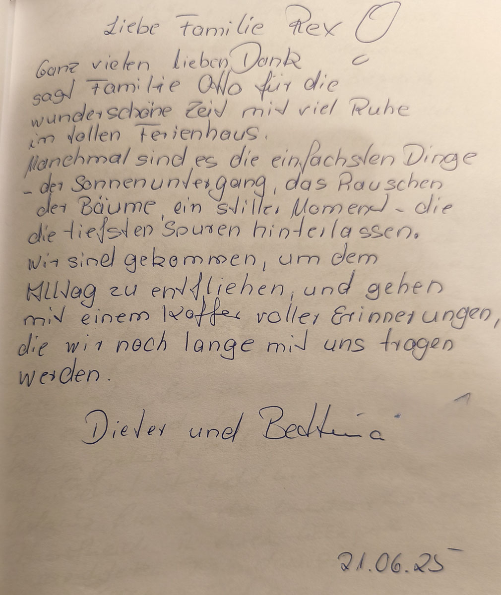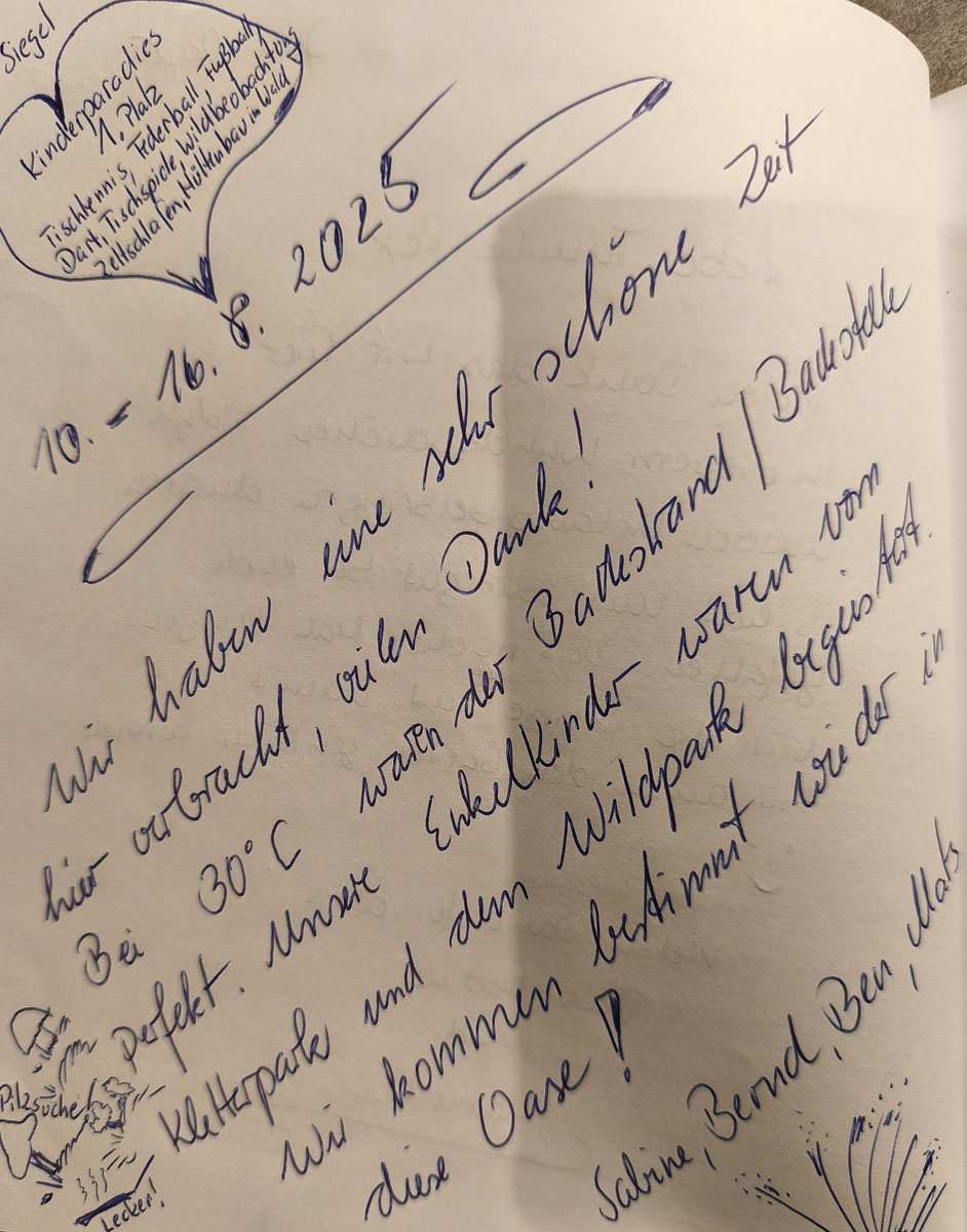 In unserem Gästebuch haben viele liebe Menschen ihre schönsten Urlaubsmomente festgehalten – kleine Zeichnungen, persönliche Worte und unvergessliche Erinnerungen. In unserer Bildergalerie findest du eine Auswahl dieser handgeschriebenen Einträge, die zeigen, wie besonders die Zeit in unserem Ferienhaus für unsere Gäste war.