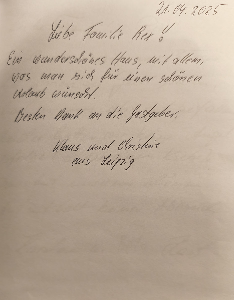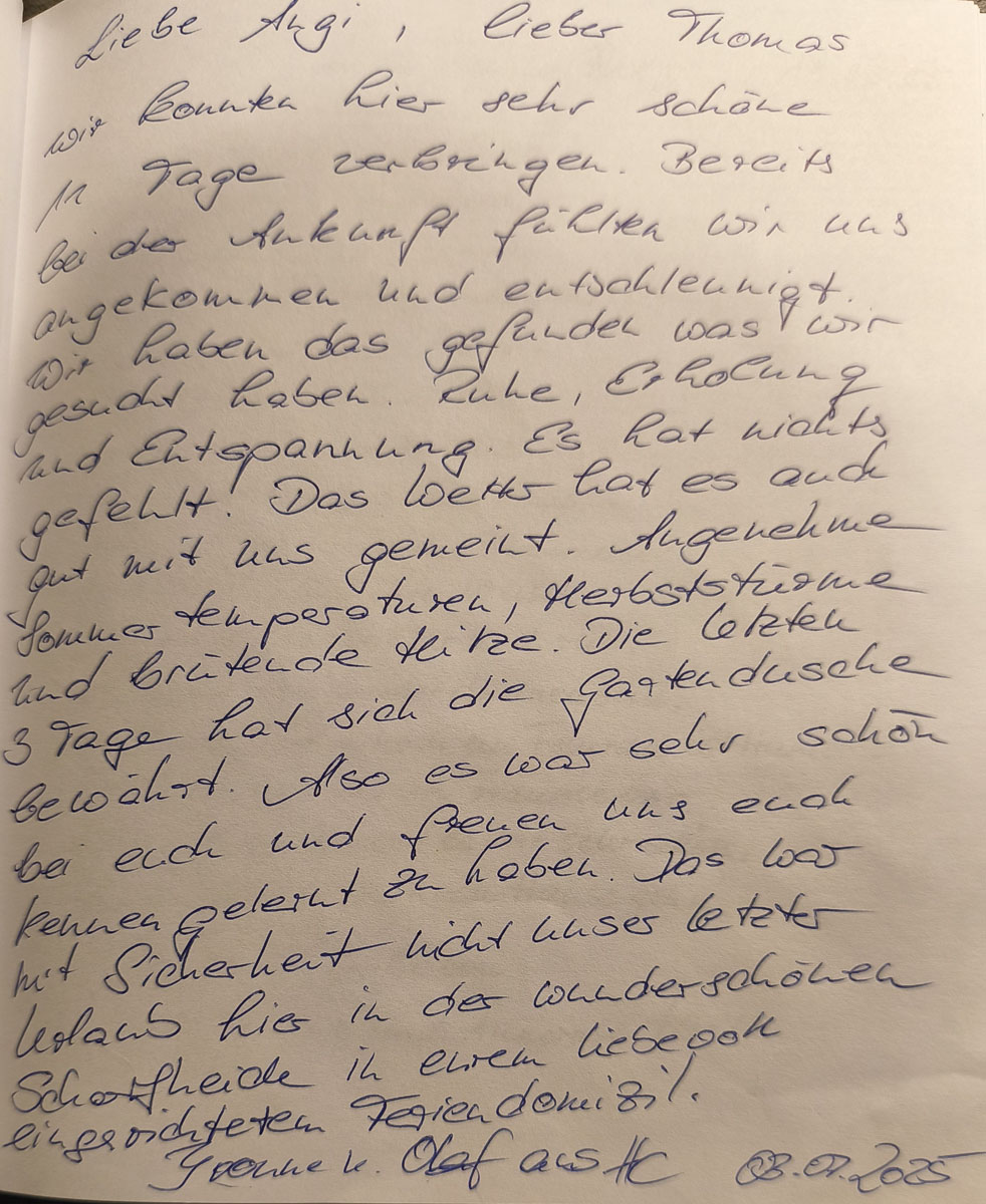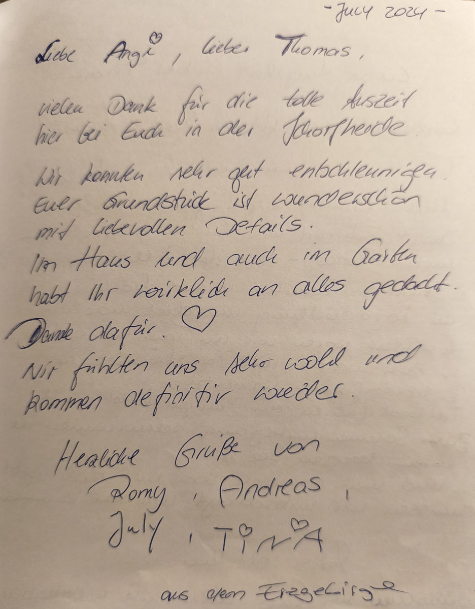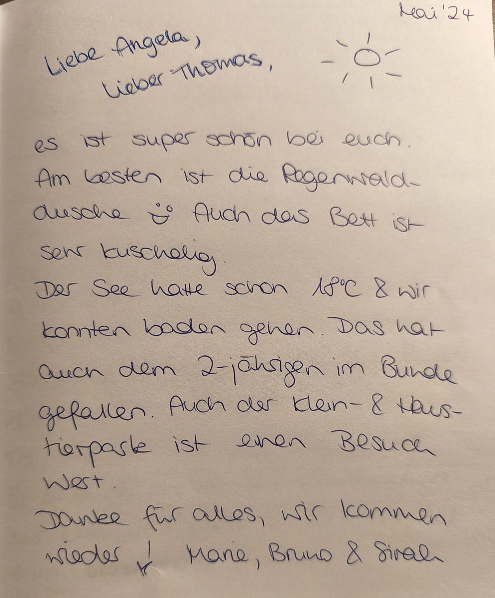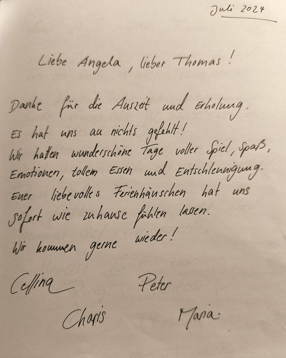 In unserem Gästebuch haben viele liebe Menschen ihre schönsten Urlaubsmomente festgehalten – kleine Zeichnungen, persönliche Worte und unvergessliche Erinnerungen. In unserer Bildergalerie findest du eine Auswahl dieser handgeschriebenen Einträge, die zeigen, wie besonders die Zeit in unserem Ferienhaus für unsere Gäste war.