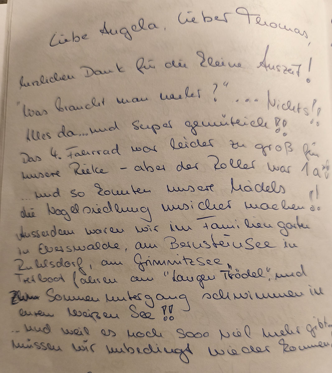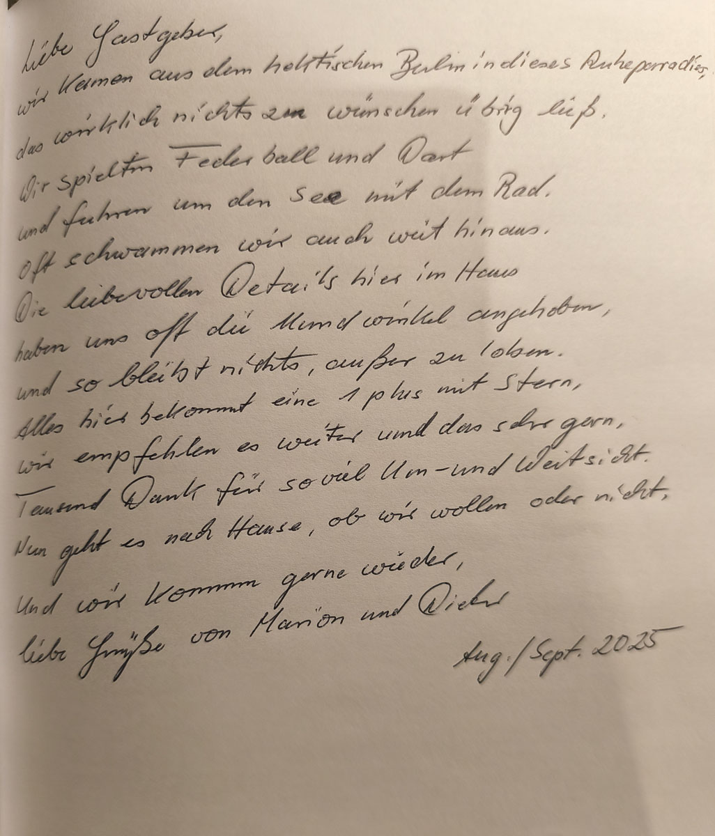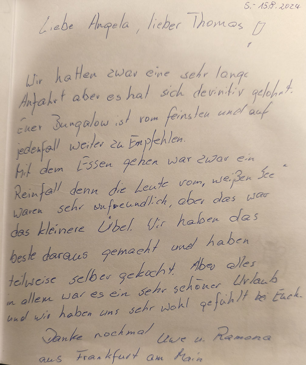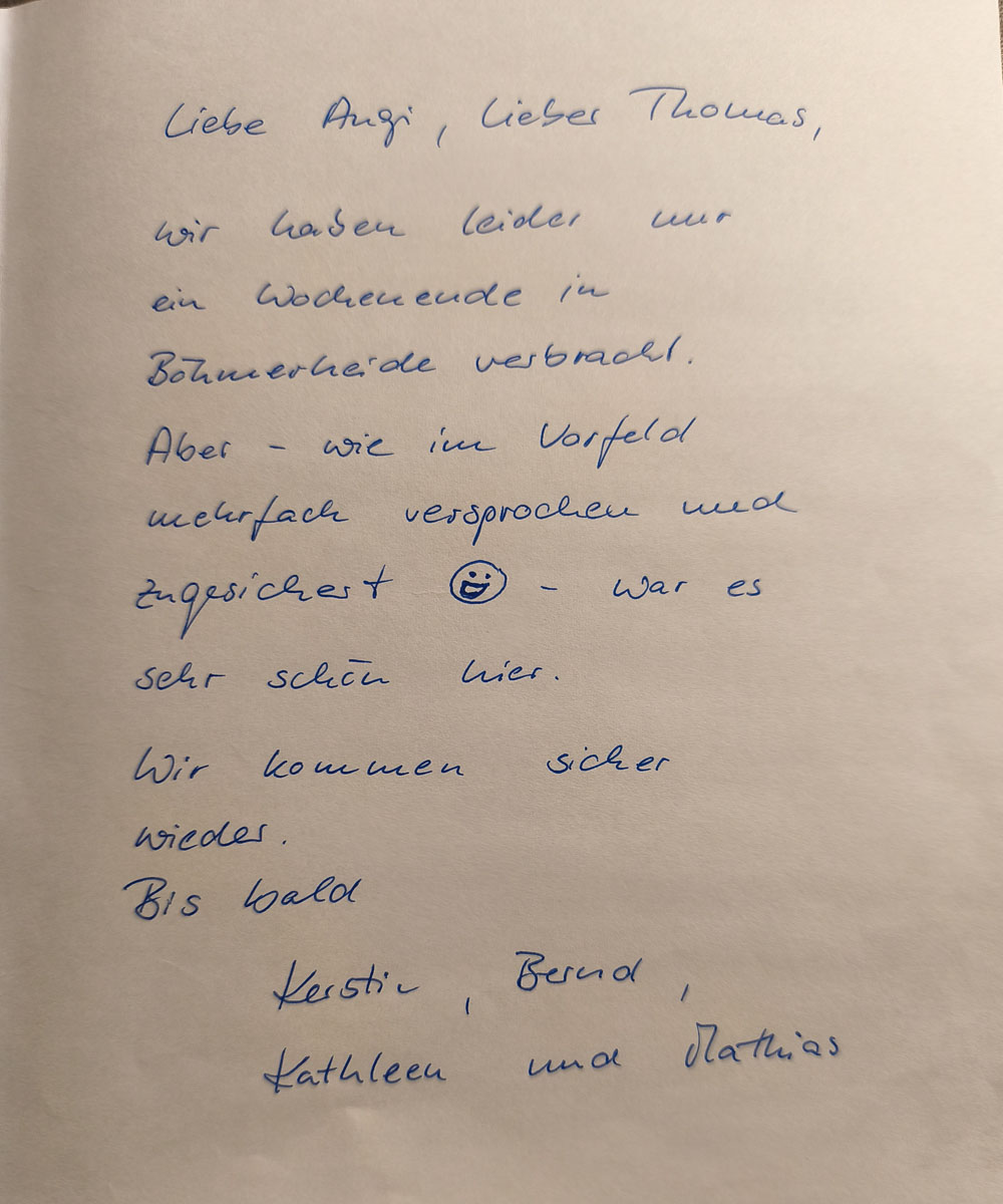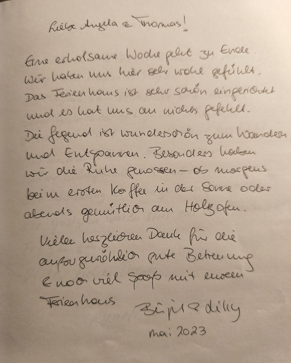 In unserem Gästebuch haben viele liebe Menschen ihre schönsten Urlaubsmomente festgehalten – kleine Zeichnungen, persönliche Worte und unvergessliche Erinnerungen. In unserer Bildergalerie findest du eine Auswahl dieser handgeschriebenen Einträge, die zeigen, wie besonders die Zeit in unserem Ferienhaus für unsere Gäste war.